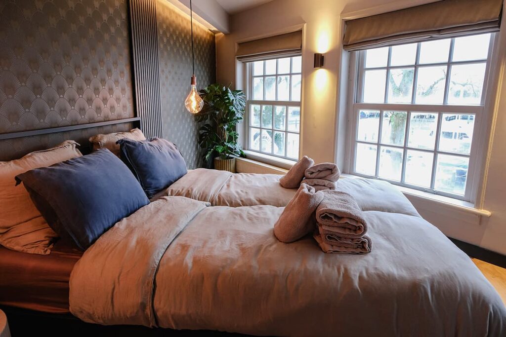 Alle vier de slaapkamers hebben uitzicht op de haven. Elk bed heeft zijdezacht beddengoed, een bureau met koffie en thee, een tv en natuurlijk hangen de badjassen klaar. De aandacht voor detail zit in alles: van de Sonos-boxen in de woonkamer en de badkamer op zolder, tot de Rituals-producten in elke badkamer, van de Nespresso-apparaat tot de heet water kraan in de keuken.