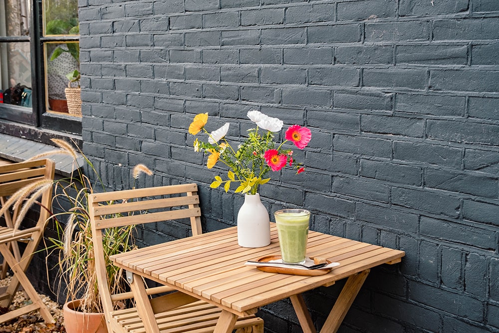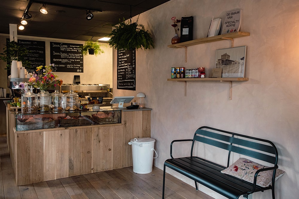 Het interieur van het café ademt dezelfde warmte uit als de producten. Dat is niet verwonderlijk: veel meubels zijn door Sterre zelf gemaakt. “Dit is eigenlijk een soort verlengstuk van onze eigen huiskamer. We ontvangen mensen hier zoals we thuis ook zouden doen.” De inrichting nodigt uit om te blijven zitten, met comfortabele stoelen en een huiselijke sfeer.